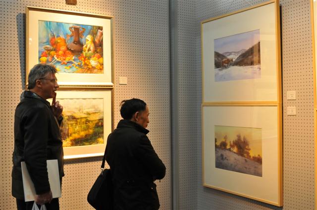 在美术馆内展示了潘长臻先生的38幅作品,从他的作品当中所透露的是一种健气。“笔力犹畅,行神如空,行气如虹,走云连风。”水彩画作为一种便捷的艺术形式、它最能够让我们理解那种以“象”为中介、直观地把握世界的绘画内蕴,并在这里真正体会陶然与天地之间的“游于艺”的自由和欢乐。在潘先生的水彩画当中,我们感到了从自然的感怀中散发出的艺术魅力和积蓄着的内在力量。多年的不间断努力,以充实来把握心意,愈近晚年,笔力愈劲,笔锋趋于老辣,色彩趋向单纯,质朴不易,笔彩俱老,格外地显出“蓄素守中”的品质。潘老先生的水彩重写意,重浓彩,于生意中追求一分纯然合一,所以在圆润苍劲的笔触中有着隐晦的热情和浪漫。