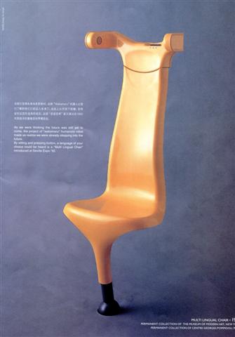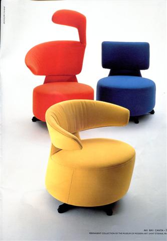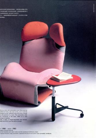在他的作品介绍里,最为人津津乐道的作品是他为意大利品牌Cassina设计的Wink沙发椅。这款译为“眨眼”的沙发椅造型可爱,能伸展能折收,既可放在书桌前也可随意躺下。靠垫上的两个“米老鼠耳朵”可以自由活动,也能温和的把人的视线分为两边,立刻把人带进如入私人空间的放松状态。沙发椅的各部分也采用不同色彩, 并提供像衣服一样可拆换的布套。这款创意和实用性完美结合的椅子被评价为“谁都想放在身边的椅子”,在1980年一经推出即成为Cassina品牌当年最畅销的家具之一。如今这件现代家居的艺术品, 已被纽约现代美术馆(MoMA)和巴黎蓬皮杜艺术中心永久收藏。