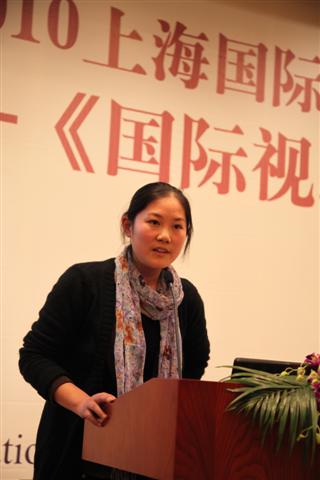 08级研究生田玉晶作为国际化教学的受益者上台演讲,她介绍了自身参与的一些国际合作项目,并表示国际化办学让她提升了专业视野拔升课专业高度、激发了同学们的创作欲望和寻找新优势的动力更提高了同学的时间能力、增强了就业竞争力。