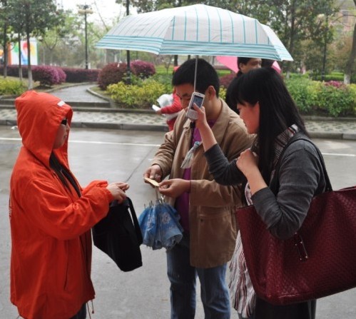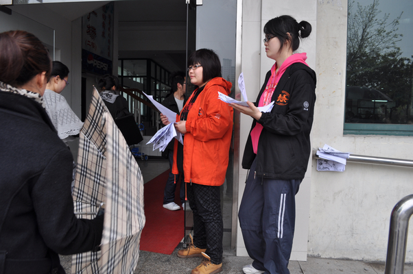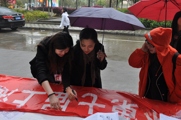 今天的宣传和签名仪式刚开始就赶上了下雨,但是风雨并没有打消大家宣传工作的积极性,反而在风雨中大家露出了更多的笑脸,一个个穿着服装学院研究生会制服的成员们,似乎在风雨中喜笑颜开,一边发放着大赛的宣传单,一边积极地引领有兴趣的同学进行签名;雨水中同学们并没有疾风而过,反而被我们这些可爱的研会兄弟姐们风雨无阻的行为与精神所吸引,主动询问关于大赛的具体详情,研会成员与询问详情的同学们在一起的热情与积极地场景,在风雨中也成了一道风景,似乎这是对我们此次大赛活动最好的宣传。