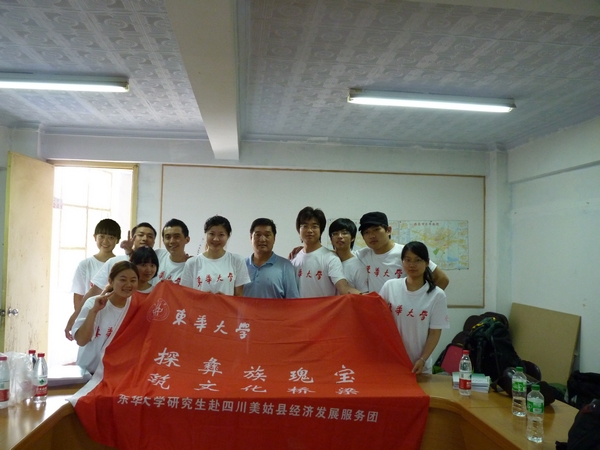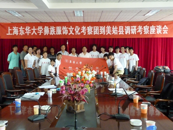 美姑位于四川省凉山彝族自治州,为西昌市管辖。团队12人经过40多个小时的辗转跋涉,于7号晚上23点到达西昌市。第二天上午团队拜访了凉山民族文化研究所并开展座谈会。研究所的马所长代表研究所对实践服务团的到来表示热烈欢迎,并提供了关于彝族文化的刊物、资料及调研所涉及单位的学者联系方式等等,会议为实践服务团工作的开展提供了建议和参考,并为后续合作打下良好基础。图2为实践团与凉山民族文化研究所所长合影。 团队于8日晚7点到达实践目的地美姑县开始了正式的考察。第二天上午,团队12人熟悉了美姑县的环境,走访彝族服装服饰专卖店并进行了试穿,获取了服饰搭配、结构、纹样方面等初步信息;下午美姑县政府及包括教育局、发改委等政府部门为实践服务团举行欢迎仪式并进行了“上海司机社