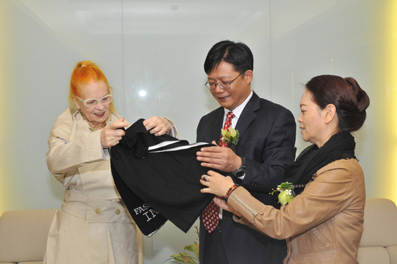 校长徐明稚教授,郑重地为薇薇安·威斯特伍德授予顾问教授的职位,并且由李院长为薇薇安女士戴上了司机社