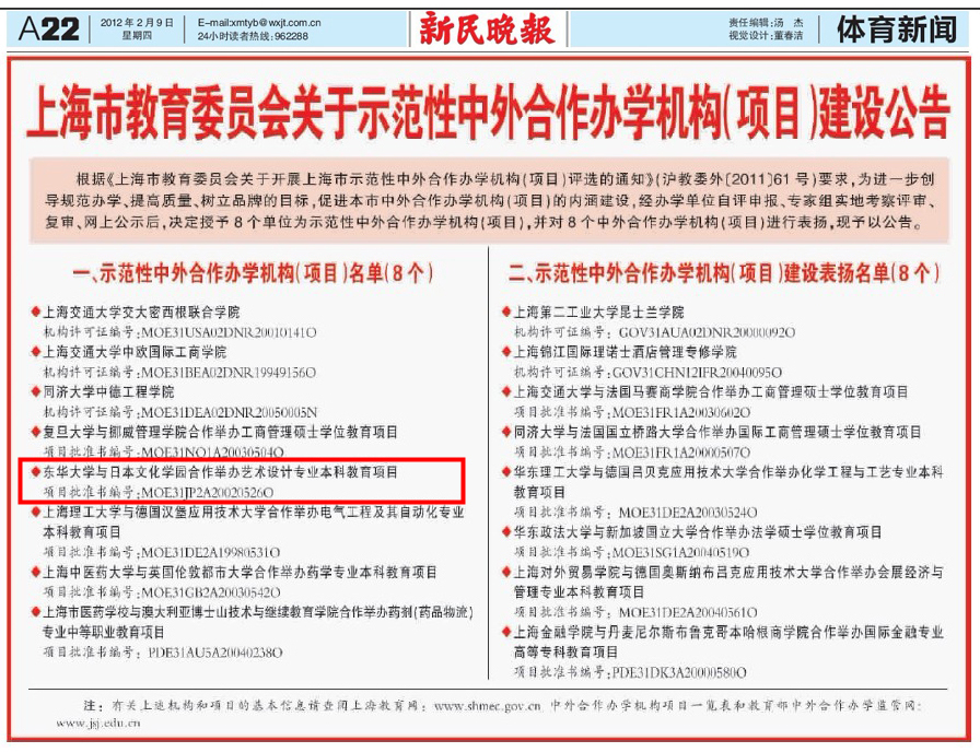 与日本文化学园合作举办艺术设计专业本科教育项目”(简称中日合作办学)位列全市8个示范性中外合作办学机构(项目)名单之中。