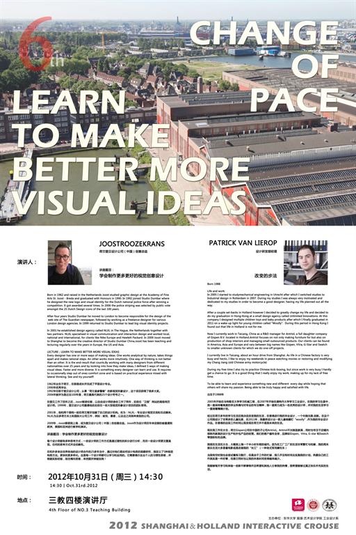 (5) 特邀嘉宾的经验交融。在课程进行中,我们邀请了荷兰登贝设计公司(中国)创意总监Joost以讲座的形式和大家沟通了“学会制作更多更好的视觉创意设计”,他提出的360度的设计思考,通过分析、强制结合、挑衅、视觉优先逻辑、思考不同的特色等五种不同的方法来发现更多更好的视觉设计;其次,我们也邀请了前年参与了国际合作课程的荷兰籍学生Patrick,和大家交流他是如何通过一次普通的国际合作课程改变了他的人生,毕业后来到中国,在中国发展,也是如何通过短短两年的时间,已经升为了某公司设计研发部经理的历程。再次,我们还邀请了s-point的设计师、迪卡侬户外用品的设计总监就课程作品及汇报和我们的学生做了交流,大家都受益颇多。