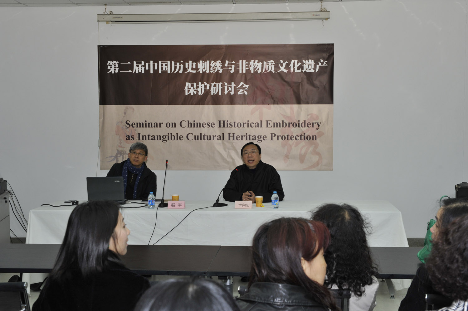 第三教学楼八楼会议厅,举办了《针尖上的书画》为主题的活动的开幕式,赵丰老师及包老师对于刺绣及非物质文化做了相关的报告。