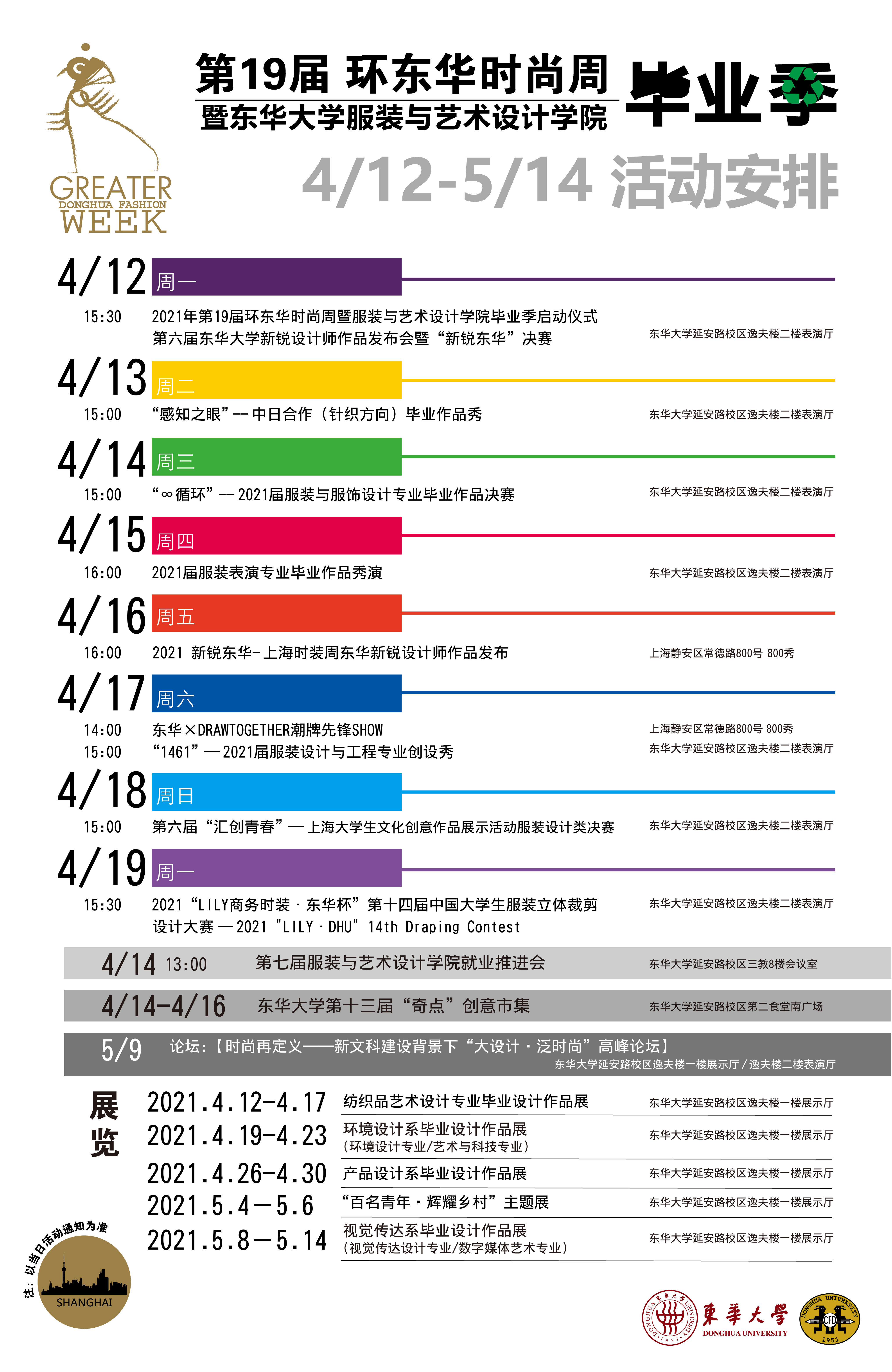 2021年第19届环东华时尚周暨司机社 毕业季在向校内外各界展示教育教学成果的同时,也希冀能够创建更多的发展交流平台,为上海建设世界一流设计之都,打造创意设计产业高地的发展建设培养输出更多的创新型优秀人才!以优秀的师生创意成果,迎接校庆70周年,献礼建党100周年!