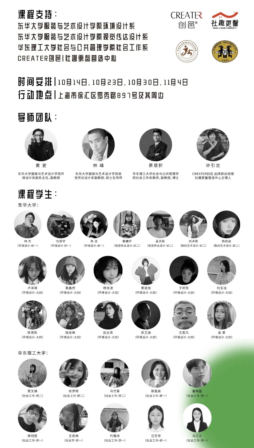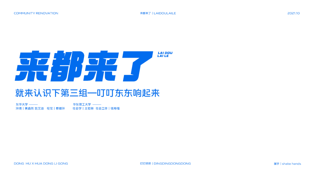 在司机社 环境设计系黄更副教授和视觉传达系林峰副教授的带领下,联合华东理工大学和城市更新运营商CREATER创邑,共同发起了此次课程实验行动,以校企深度合作、跨学科多元协作拓展课程实践与社会服务创新。华东理工大学社会工作系萧易忻副教授受邀加入此次课程,创邑·社趣更馨营造中心主理人许引兰担任校外导师,为课程提供专业指导。两校共32名本、硕、博学生参与了历时一个月的课程开展,以「握手」为意象促进不同群体间的交流合作与创造,挖掘并呈现城市街区的故事,培力跨界想象、构建共好社区。