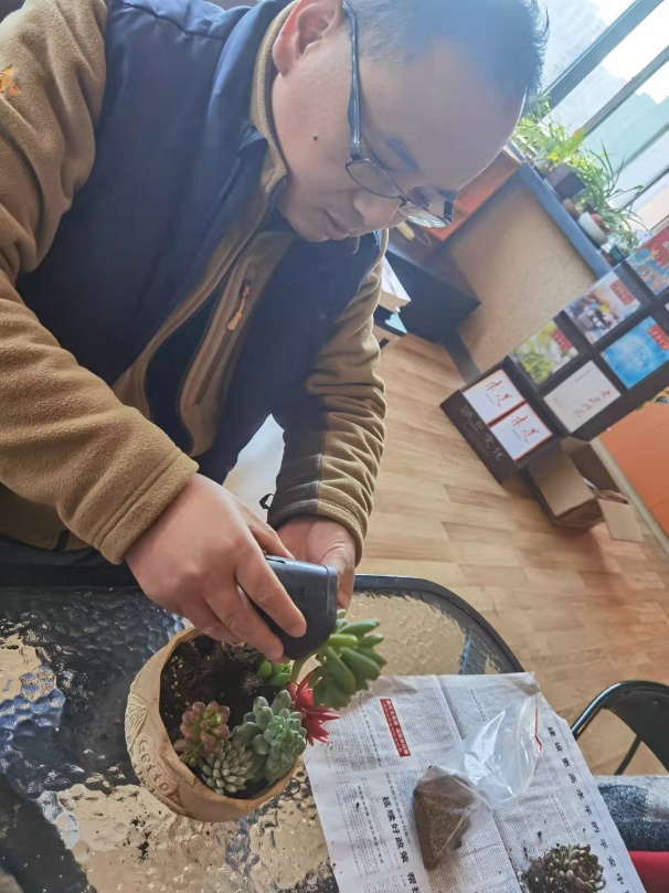 本次工会活动专门为全院教职工准备了五彩斑斓的多肉盆栽和生机勃勃的绿植,同时老师们也可大显身手,亲自动手制作专属的多肉盆栽。活动吸引了很多教职工来到教工之家参与活动,铺沙、翻盆、造型、填土,老师们忙得的不亦乐乎,制作完成了不少佳作。