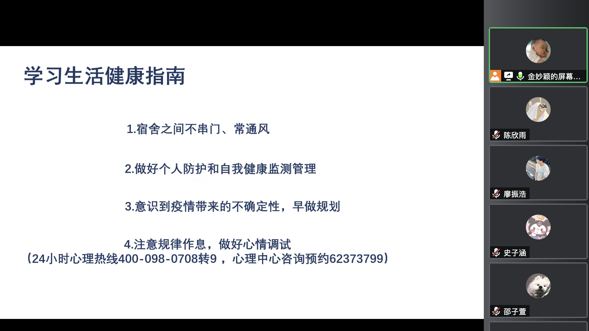 围绕低年级学生的发展需求,辅导员通过列举在抗击疫情过程中的优秀事迹与榜样力量,激励学生像身边榜样学习,埋下信仰的种子,找准发展目标。围绕高年纪同学面临选择的发展性需求,辅导员在班会中将考研经验分享会、疫情当下的就业形势等内容融入本次的同心战疫主题班会中,同时通过玩转腾讯会议背景墙等方式充分调动学生的主观能动性,激发学生通过疫情故事爱国爱党爱中国特色社会主义的热情,引导学生将个人发展与祖国发展紧密相连。围绕国家提出培养创新型高层次研究生人才目标,研究生辅导员利用主题班会引导学生做好封闭管理时间规划,共为唇齿 共克时艰,胸怀大局,精湛学业铸就共同岁月。