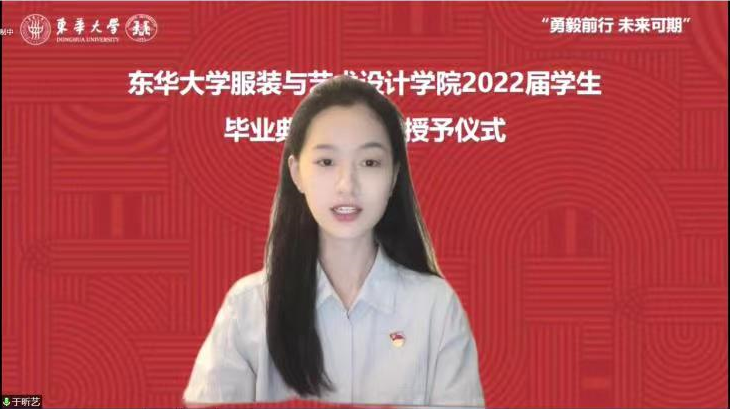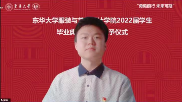 来自服装设计与工程2018级卓越班毕业生李博一,他回忆了四年的大学生活里的美好记忆,不管未来选择什么道路,都会牢记母校教诲,做拥有智慧并富有激情的、胸有大志并脚踏实地、德才兼备并勇于创新、负有责任并敢挑重担的人。表演1901班于昕艺作为在校生代表表达了对师兄师姐的感谢和不舍,为毕业生们送上祝福,祝愿毕业生们早日成为一名令母校骄傲的东华人。