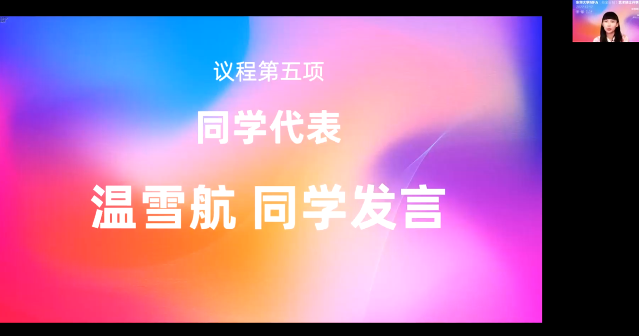 2022级温雪航同学作为新生代表发言。温雪航同学呼吁全体MFA同学恪守“崇德、博学、砺志、尚实”的校训,和 “严谨、勤奋、求实、创新”的优良校风,求学路上要勇于创新,敢于质疑,不断提高自身综合素质,在东华收获真知,书写人生路上崭新的华丽篇章。
