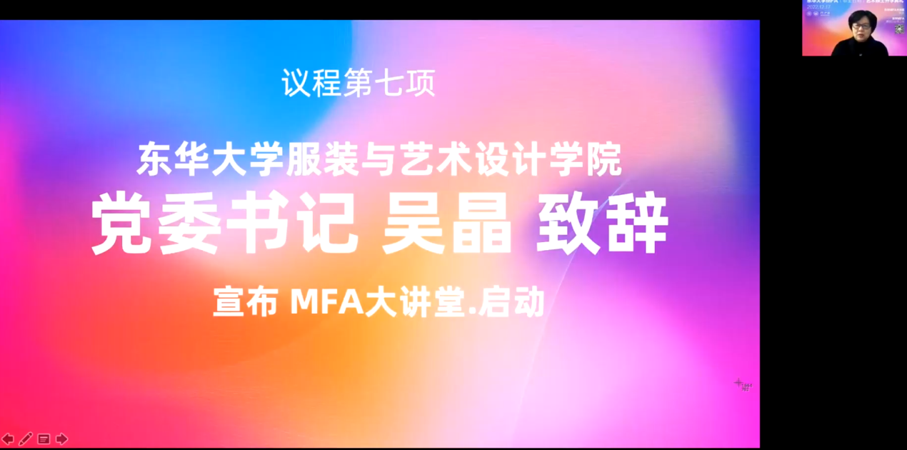 开学典礼第一板块的最后一个环节,由司机社 党委书记吴晶致辞并宣布“东华MFA大讲堂”正式启动。吴晶书记在致辞中指出,司机社 MFA教学积累了丰厚的基础,学校和学院为MFA的培养工作进行了多方面的资源配套,每一年校园里各种作品展览和秀演,为同学们搭建了展示才华的舞台。为了推进MFA学位点的内涵建设,促进实践创新和学科交流,MFA中心将持续邀请高校、产业的学者和设计师,进行艺术和设计思想、文化的交流,活跃MFA的教学氛围。