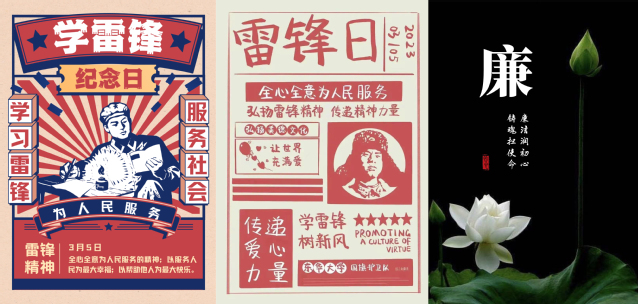 为深入学习党的二十届二中全会精神,贯彻落实党中央《关于加强新时代廉洁文化建设的意见》,深入开展学习贯彻习近平新时代中国特色社会主义思想主题教育,学生党支部结合专业特色,开展以“学雷锋精神,展青春风采”、“廉洁润初心·铸魂担使命”等为主题的手绘作品征集活动。国旗护卫队党支部以雷锋形象和志愿服务为元素,提笔“画”说践行;研究生学生党支部挖掘提炼廉洁校园文化的思想内涵,“清心妙语”创作公益海报,营造良好育人环境。