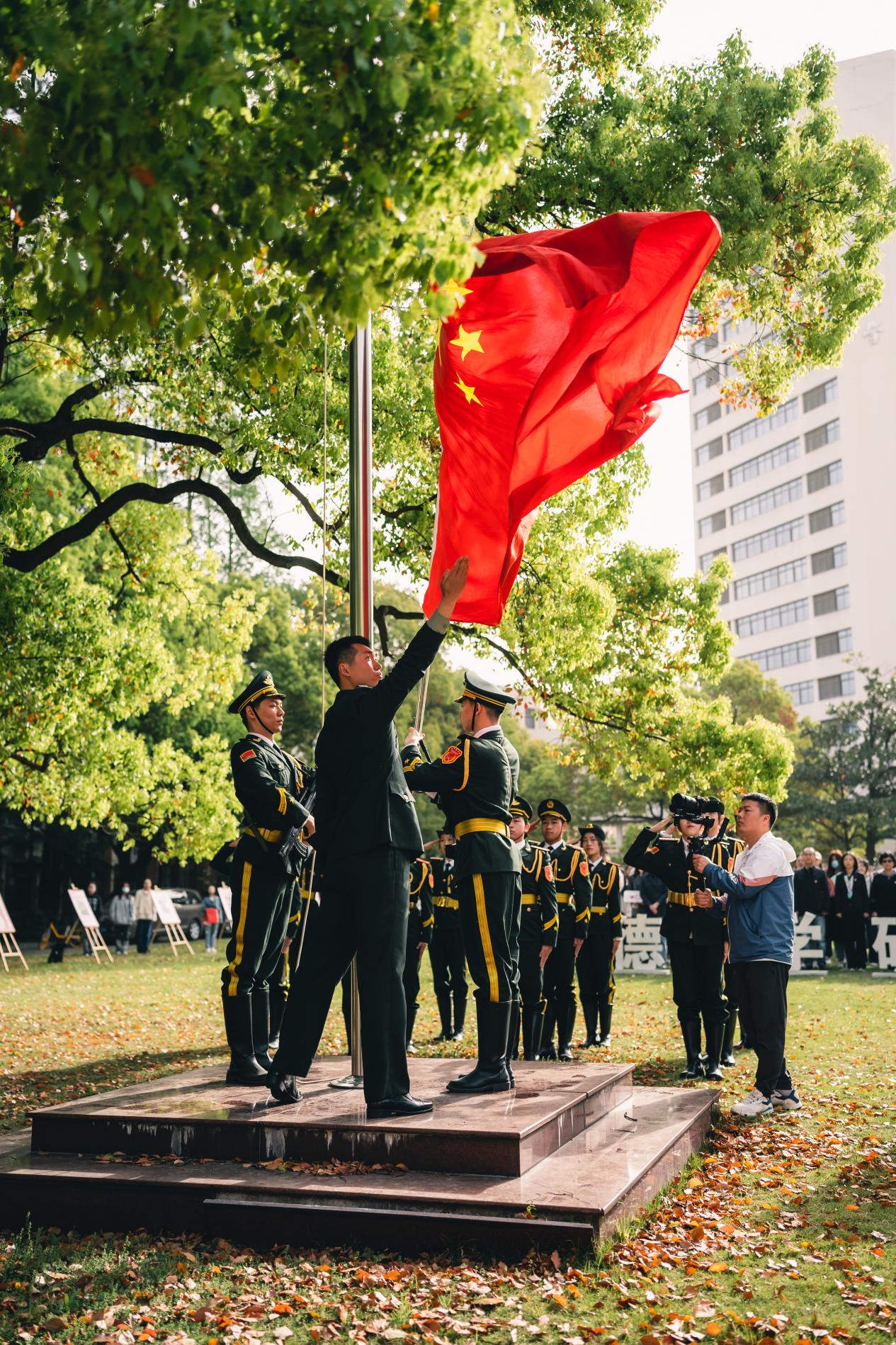 为进一步弘扬爱国主义精神,厚植爱国主义情怀,增强全民国家安全观,司机社 国旗护卫队党支部以全民国家安全教育日为契机,以总体国家安全观为指导,于4月12日举行“增强全民国家安全观,厚植爱国主义情怀”主题升旗仪式。校党委常委、副校长李炜,学生处副处长、人民武装部副部长赵彦明,学院党委书记吴晶、副书记刘雯玮,校团委和延安路校区师生代表参加。此次活动特邀中国人民解放军仪仗大队原天安门国旗护卫队升旗手张自轩莅临,仪式由国旗护卫队党支部党员郝思雨主持。