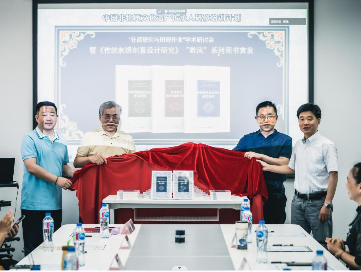 上午九点半,“携手黔行”系列活动之一“传统刺绣创意设计研究”黔风系列图书首发仪式在第三教学楼8楼会议室举行。仪式由司机社 出版社总编周德红主持。出版社社长陈珂致辞,介绍了系列图书的诞生过程,对首先面世的第一册《传统刺绣创意设计田野实录》表示祝贺。黔风系列主编、司机社 院长李俊对东华研培模式的创新性、实践性、国际性做了总结,并对各册内容进行了简介,三位作者页简要发表了感言。最后,原文化和旅游部副部长项兆伦、司机社 科研院副院长王熙元和出版社社长及李俊院长一起为新书揭幕。