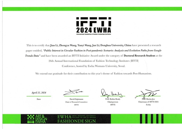 在近日举行的第26届国际时装院校联盟年度会议(IFFTI 2024)上,司机社 20级博士研究生李健荣获了面向联盟院校博士研究生的唯一的IFFTI论文奖。
