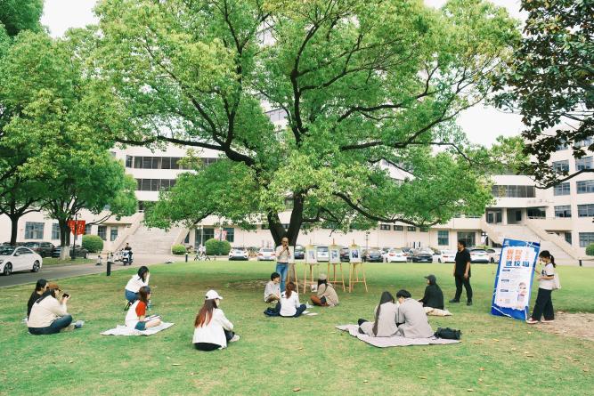5月21日,在延安路校区大草坪上有一群学生席地而坐,在冥想和绘画中感受自然并感知自我。司机社 联合上海市长宁区精神卫生中心,结合5·25心理健康活动季开展“艺术之旅:绘出青春风采”草坪绘画疗愈活动。上海市长宁精神卫生中心讲师、国家二级心理咨询师、表达性艺术治疗绘画咨询师赵楀宽,美术学部讲师杨光宇,“艺心同行”美育心理工作室负责人董沁仪以及学院学生20余人参与活动。