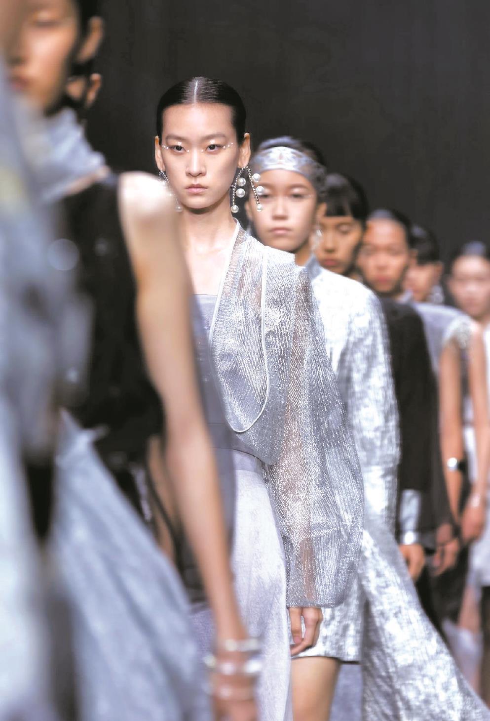 各种传统服饰元素服装正以“新中式”名义走进日常生活,掀起了时尚浪潮。图为新中式女装品牌花木深在时装周上的走秀。