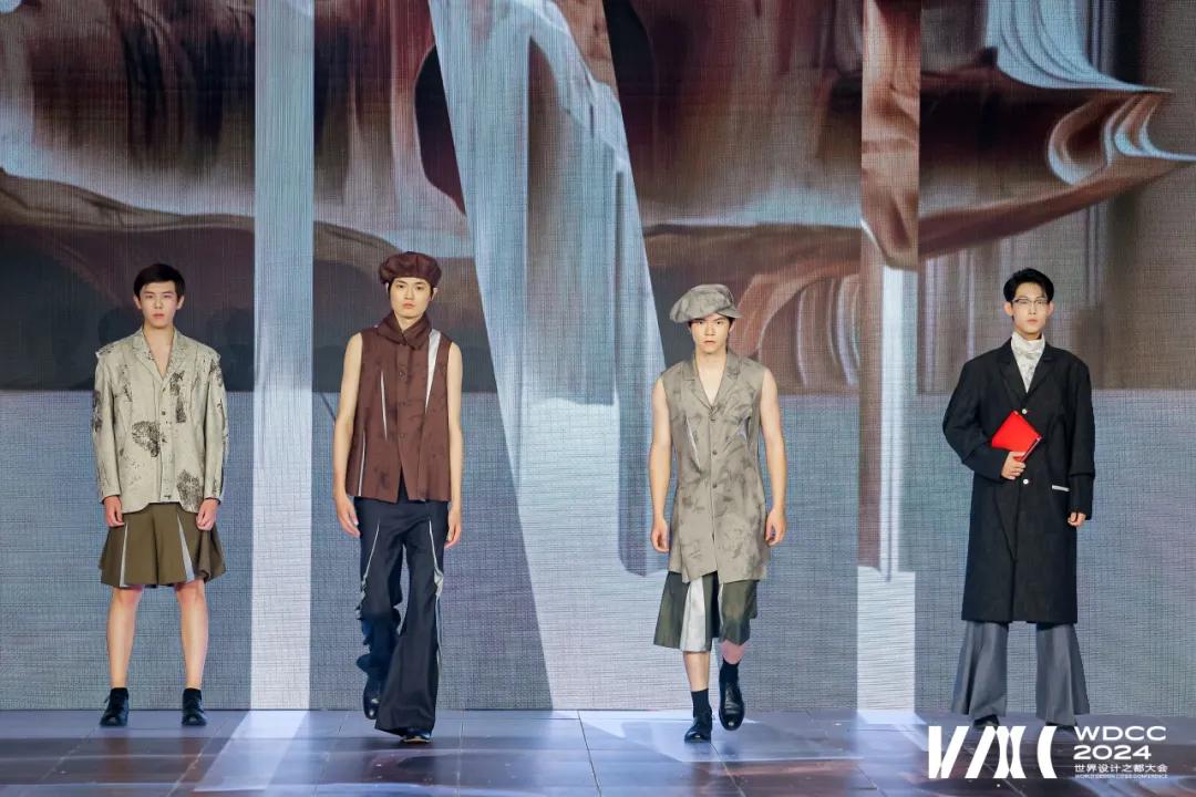 秀演现场,模特们身着华服,每一步都踏在时尚的节拍上一一走来。凸显文化传承、匠人质感,诠释前沿时尚概念,应用虚拟时尚、AIGC辅助……从复古经典到前卫未来,从简约大气到繁复华丽,款款作品让人目不暇接。从面料的选择、剪裁的精细,再到装饰的细节,每一件作品都承载着东华新锐设计师的心血与灵感,无不透露出他们在世界设计舞台的极致追求。