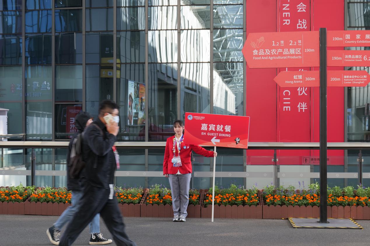 此外,学院“小叶子”更多的工作是解答嘉宾、观众关于具体场馆的位置、就餐地点、离馆通道等路线问题,以及在哪里能存储行李、何时解封道路、论坛嘉宾能否参展等细节问题。她们披星戴月,克服困难,以充实的知识储备与积极的工作态度保障开幕式与虹桥论坛的顺利举行。“小叶子”们指引时的笑容、解答问题时的从容都深深刻下了她们在进博最青春的模样。