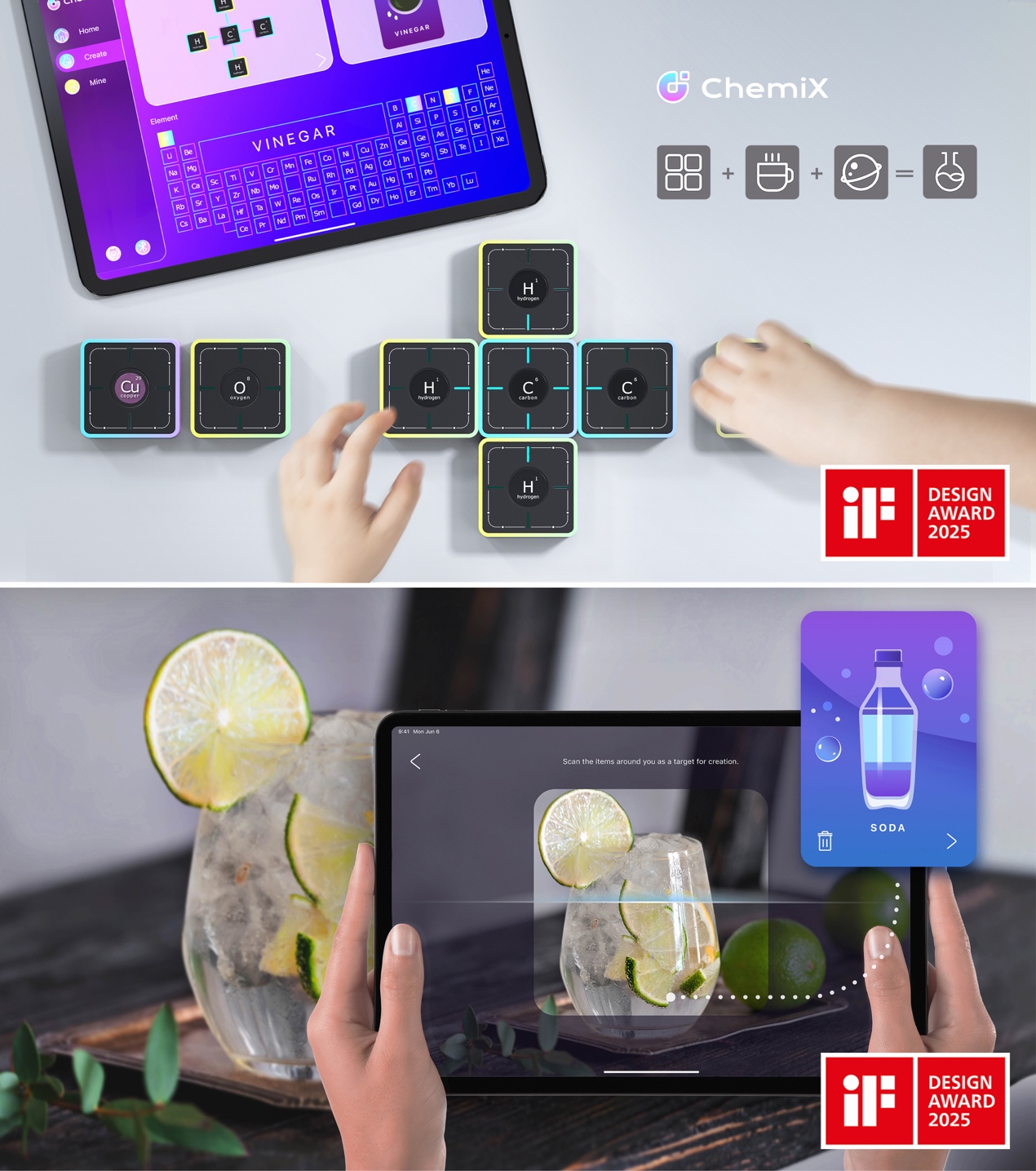Chemix是一款专为学习化学知识而设计的创新教育产品,旨在从认识生活中的物品出发,结合游戏化的化学元素周期表排列组合方式,帮助学生轻松掌握抽象的化学概念。它包含一组NFC磁吸化学元素模块和配套的学习平台。每个模块都嵌入一块化学元素模型,学生可以根据提示,按照元素周期表的规则自由拼接模块,形成与生活物品相应的化学化合物。Chemix不仅让元素之间的关系一目了然,更让学生在生活和实践中感受化学的魅力。